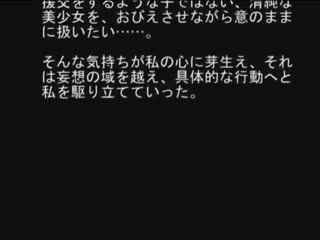 Overview: 46歳中年のロリコン短小童貞不能男が、個人撮影で知り合ったお嬢様女子校の不良少女に頼み込み、清純同級生を紹介してもらい、個人撮影だと騙して、美少女の嫌がる顔が見たいがために、少女に対する妄想を具現化していく…。