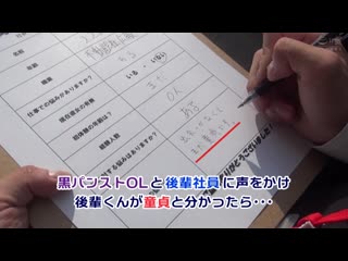 紹介: 外回り中の会社のリアル同僚男女に声をかけ黒パンストが似合う美脚女先輩と童貞で悩む後輩くんに筆おろしミッションに挑戦してもらいました!部下の突然のカミングアウトに戸惑う女先輩も目の前のフル勃起チ○ポにオマ○コが疼き出す!ずっと前から憧れていた女先輩の美脚で擦られ!挟まれ!脚コキされ童貞チ○ポは暴発寸前!日中履きっぱなしのムレた黒パンストを脱がさず履きっぱなしで筆おろし中出しSEX!